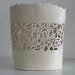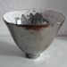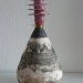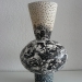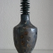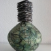 Een vaasvorm van 39 cm hoog bewerkt met mangaan oxide en voorzien van geglazuurde dots en turqoise glazuur. De vaasvorm is afgedekt met gestapelde. ronde, turqoise plakjes met daartussen een zilveren knoop.